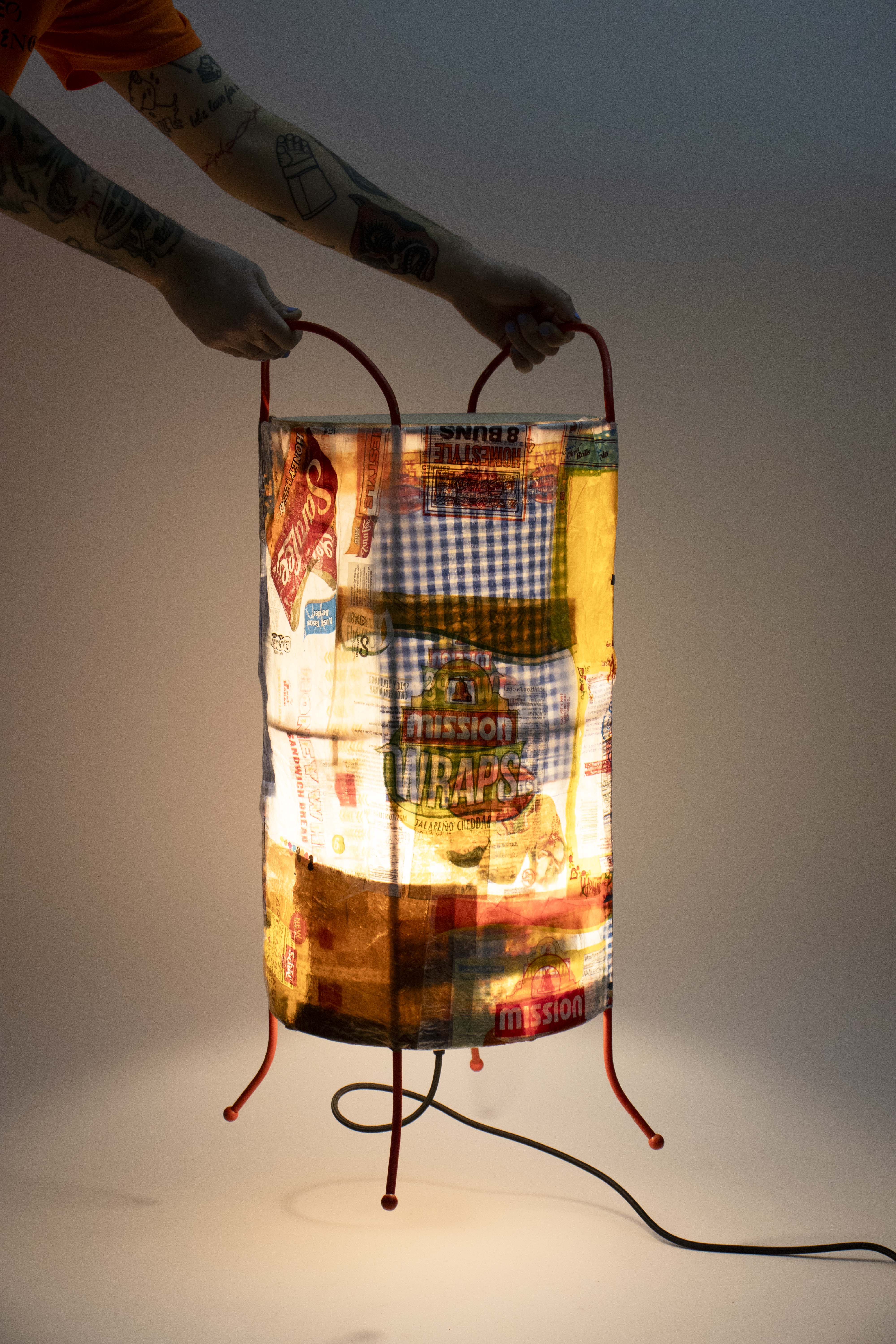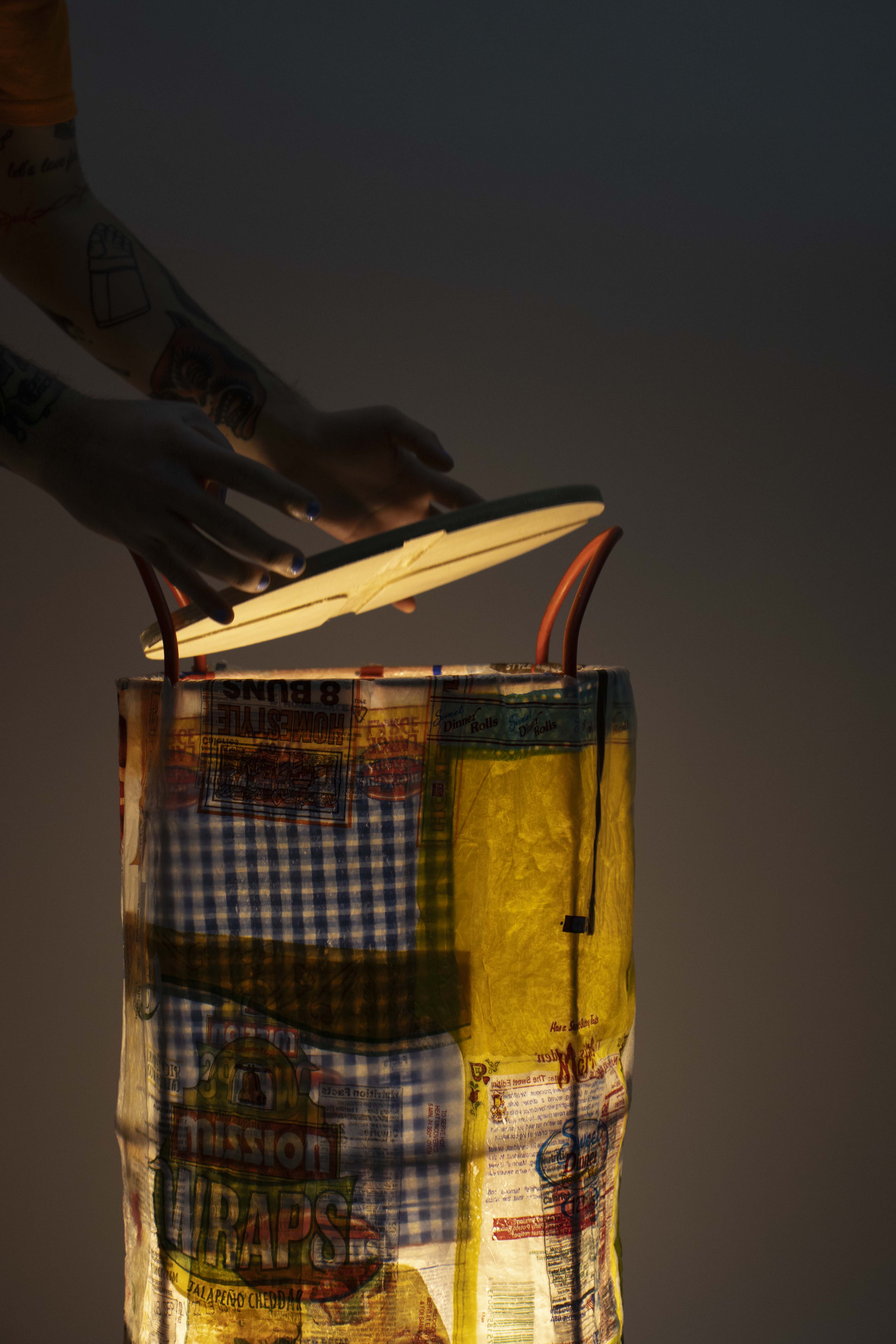 The "Bread/Butter" lamp exemplifies the ubiquitous use of plastic packaging, specifically the LDPE bread bags. Illuminated by the light, the laminated graphics create intricate visual effects that reflect the conflicted relationship between plastic and the modern consumer. The relationship is then further amplified through the contrast of traditional paper's lantern form and the artificial vivid color of the bread bags.
